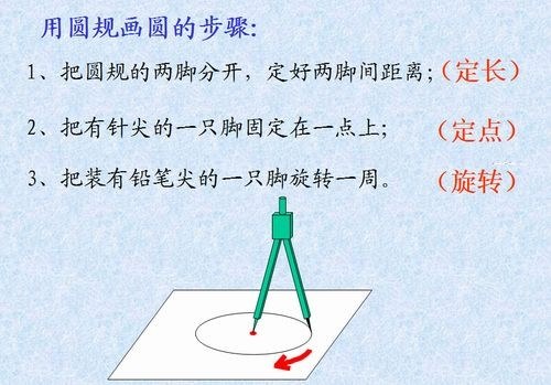 在前五个图形出现之后,我指着最后一个图形说:这就是我们今天要学习的新图形:圆。 你能指一指它的边吗? 你觉得圆和其他图形的边相比较,有什么不同地方? 生1:圆的边是弯曲的,其他五个图形的边是直的。 生2:圆形是又一条曲线围成的封闭图形,其他图形不是由曲线围成的封闭图形。 师:说的真好,板书:曲线。在生活中我们能在哪里见到圆呢? 生1:1元硬币是圆的 师:你能指一1元硬币的哪里是圆的吗? 生:在投影下用手指一指1元硬币的边缘 师:那我们怎么说才更加准确呢? 生1:1元硬币的轮廓是圆形的。 师:这个可以。还有哪里能见到圆? 生2:电风扇的旋转轨迹是圆形的。 师:能听得懂吗?什么叫旋转轨迹? 生3:就是电风扇旋转的形状。 师:用手比划一下。 师:还有吗?学生出现短暂的停顿,看一看后面 学生看到钟面了,大声说:“钟是圆形的” 生4:不对,钟的轮廓是圆形的。 [反思] 学生的语言不好规范,虽然一再规范学生该怎么说,但是还是有学生说错,加上是集体回答,所以整个班级的回答声音不是那么整齐,有说错的也有说对的,总是感觉不顺,下不去。 2.用圆规画圆 整个环节原本设计上是没有问题的,主要过程如下图呈现: 但是在学生操作的时候,发现学生还是有画不圆的,主要出现这样的几种情况: (1)不固定。 定点和定长都不能固定,主要体现为:在一开始画的时候,能够固定,但是在旋转的过程中,定点和定长都会发生偏离。 (2)重复描。 在画的时候,因为用力不均匀,所以会出现有部分淡的问题,而且这部分学生的圆规用铅比较粗。 总之一句话,还是感觉不顺。 3.认识直径和半径。 直径:通过圆心并且两端都在圆上的线段叫做直径。三个关键词 (1)必须通过圆心 (2)两个端点必须都在圆上 (3)必须是线段 学生的掌握并不好,也许是我的要求过高,学生怎么都说不全,还是感觉相当地卡。 半径:连接圆心和圆上任意一点的线段是半径。也有三个关键词 (1)必须通过圆心 (2)一个端点必须都在圆上 (3)必须是线段 问学生:图上的圆,半径和直径有什么相同之处?我期待的回答是:(1)必须通过圆心;(2)另外一个点必须在圆上;(3)必须是线段。学生整体性卡壳。 随后的配套练习,学生能说出来哪条是直径哪条是半径,但是说不清楚为什么,是不是“感觉”而已我不得而知。 4.同圆和等圆的关系