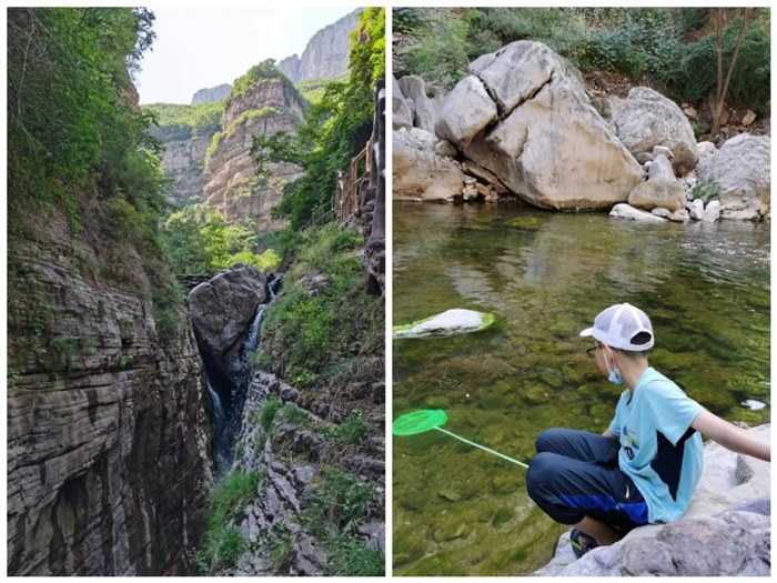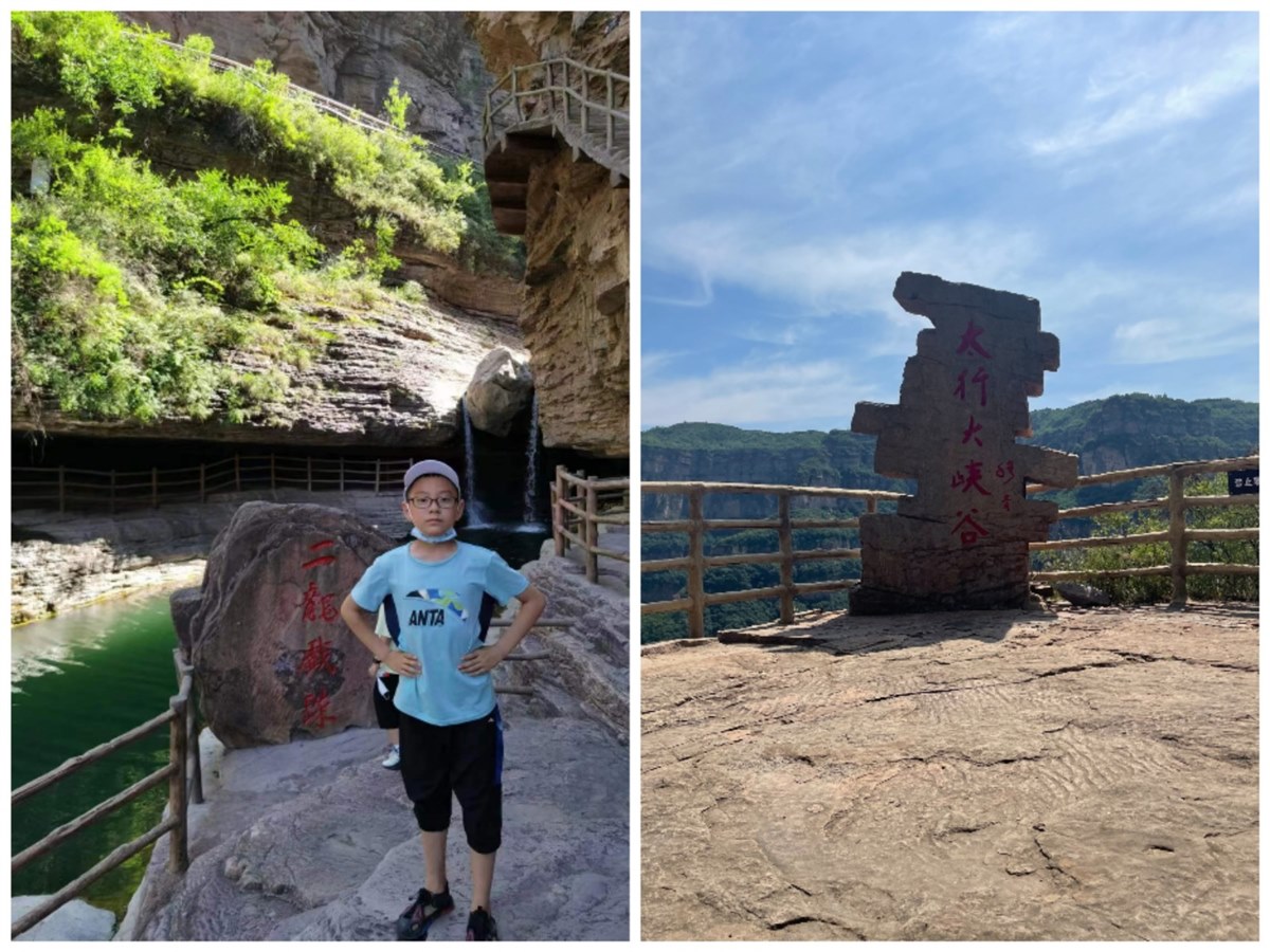 | 太行山大峡谷游记 郑州市金水区文化路第一小学 四三班 红星闪闪小分队 郭若石 如果说,绵延八百里的太行山是一处自然天成的画廊,那太行山大峡谷就是这画廊中最迷人的地段,走进大峡谷,山是凝固的画卷,水是流淌的诗行。看,那绿浪滔天的林海,刀削斧劈的悬崖,碧波荡漾的深潭。让你禁不住感叹大自然的鬼斧神工! 山路弯弯曲曲,坐在观光车上就像坐上了过山车,凉凉的山风吹过,我的心情完全放飞了,感觉自己置身仙境。 从桃花谷景区入口,首先见到的是黄龙潭大瀑布,又称子母潭。这里有上下双瀑双潭相连,上潭为“子潭”,瀑布从崖头像孩子们的滑梯一样流下来,跌进下面一个圆缸形的深潭里,这个圆缸有一个豁口,溢出的泉水从豁口再次奔腾,而出形成第二瀑布,瀑布下的“母潭”水面较为开阔平缓,就像一个沉稳大气的母亲在安详的看着自己的孩子在嬉戏玩耍。黄龙潭下有一块巨石,名为“琴台石”,传说姜子牙曾经来到此处,被这里的山光水色所陶醉,就席地而坐,支起琴台,弹起乐曲。现在,当你静坐此地,还能听到优美的乐曲在耳边回响。 听着潺潺的流水声,贴着山体拾级而上,前面有一个吊桥,虽然不大,但是走在上面摇摇晃晃,下面就是万丈深渊,所以走过去还是需要一些勇气的。过了吊桥看到石壁上有两个红色的大字“含珠”,我一边念着这两个字,一边往前看去,红色岩石的峡谷中夹着一块像是从天而降的灰色巨石,经过上万年的水流冲刷,这块巨石表面变得圆溜溜的,从下往上看去,河流就像一条巨龙,灰色的岩石就像含在嘴里的“珠子”。我终于明白了“含珠”的来历,真是太形象了! 在大峡谷中游玩,你不会感觉劳累,逆水而上,氧气充足,清澈见底的溪流中鱼群穿梭,随时可以捞上几条。“双龙戏珠”景点更是惟妙惟肖,它有两股瀑布和瀑下深潭组成,瀑布从上至下倾泻而出被卡在两座山体之间的一块石头分成两股,同时注入深潭,远远看去,宛如在水中嬉戏的两条矫健的白龙。此景点位于景区的中程,潭水深约12米,是亿万年来水流长期冲刷的结果,潭水清澈宜人,苍翠夺目,是连接在桃花谷溪中的一颗温润的碧玉。 不知不觉我们已经走了两个小时的路程,山水迷人,真有点不知归路。再见了,这峰峦叠嶂的大美太行,感谢大自然的馈赠,让我不虚此行! |