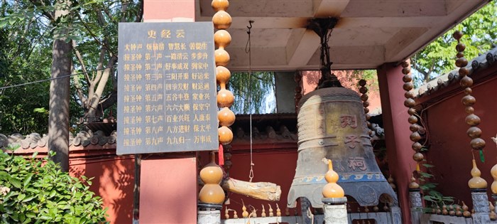 再往里走,又是一进院子,正对着院门的是祭祀列子的大殿,列子的塑像端坐正中,俯瞰着前来朝拜的男男女女。大殿为三间,雕龙画凤,煞是壮观。院门右侧有一小亭,里面置有一个大铁钟,传说这是列子下凡铸就的铁钟,如果按照列子的吩咐,这口钟可以声震洛阳,但是后人言而无信,毁了这口钟,导致它只能声闻三十里。与之对应的左侧也有一个小亭,里面放着一面打鼓,轻轻拍打,就会发出震耳欲聋的声音。