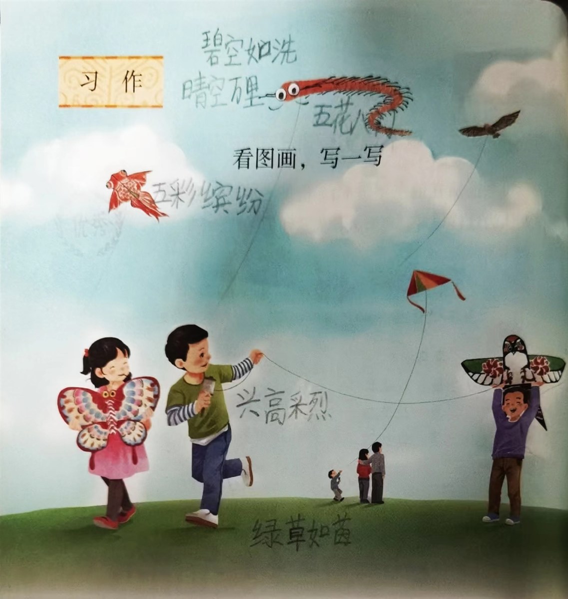 | 看图写作—放风筝 春天来了,风和日丽,是一个放风筝的好时节。 这一天,在青青的野草地上,大家都在开开心心的放风筝。瞧!在那边,小明和小刚也在放风筝呢。 他们俩配合的十分默契。小明在前面牵线,小刚在后面举着风筝。忽然,小刚开口喊道:“风大了,风大了!”小明说:“放!”小刚猛地一松手,然后小明便跑了出去,边跑边放线,放完还不忘记抖一抖线,抖完线又放线……终于,他们把风筝放起来了。小草在旁边看得为他们鼓起掌来。 小明和小刚看着天空,他们看到了自己的燕子风筝,还有长长的蜈蚣风筝,威风的老鹰风筝,漂亮的金鱼风筝……争奇斗艳,非常壮观。 这时,他们听到了一个小女孩的哭声:“呜呜呜,为什么我的风筝放不起来,为什么?”小明安慰道:“不要哭,我们帮你把风筝也放起来好不好?”“好啊!”小女孩笑着说。于是,小明和小刚也把小女孩的风筝放起来了。 小女孩的蝴蝶风筝在空中自由飞翔,她一边追着风筝,一边拍手欢呼。看看远处的一家三口,小男孩在放彩色的三角形风筝,他的爸爸妈妈相互依偎着看着远方,多么温馨的一家人啊! 野草地上成为了一片笑的海洋,天空中成为了风筝的天下。 |