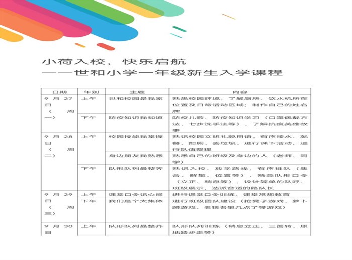 入学礼是一个开端,也是孩子在学校上学正式开始,孩子的快乐体验与情感认同永远是第一位的! 四、以儿童思维构建入学课程,和谐衔接 幼儿独特的思维方式是以具体形象思维为主,而小学阶段则是从形象思维到逻辑思维的逐步过渡,因此在入学课程的设计上,幼小衔接课程会以幼儿主导思维方式为主,进行循序渐进的逐步过渡。学校的幼小衔接课程分为四个模块,以近似幼儿园教育的形式,让孩子们顺利过渡至小学生活。 (一)预计达成目标 1.初步适应并喜欢学校生活,愿意和老师、同学交流。 2.能对学习、活动产生一定的兴趣,并不断产生好奇心。 3.能了解学校生活的基本行为规范,并积极付诸行动。 (二)入学课程模块 模块1:识校园,主人翁意识的激发与确立 在熟悉小学新环境的过程中,世和小学采取分主题、分版块的形式来让孩子们更全面、透彻的了解与认知。 我们的学校——熟知学校环境和设施 我们的班级——第一次班会、第一次午餐、第一次班级展示 我们的老师——认识老师与校内工作人员 我们的同伴——认识同伴的小伙伴 同时每个孩子都会有一枚自己的姓名牌,树立孩子校园主人翁的意识,也让孩子能够在最短时间里认识并结交到新朋友。 模块2:懂规范,循序渐进适应小学生活 幼儿园和小学在作息制度上差异较大,让孩子们逐步快速的适应各种规范,才能让他们更快的跟上小学生活的步伐。 一日常规——会看课表、合理安排; 尊敬师长、团结同学; 文明有礼、爱护公物 劳动与服务——收拾书桌、会系鞋带、 参加值日、自己动手自己做 模块3:讲卫生,学会安全防护守健康 因疫情常态化影响,引导学生学会防疫儿歌、防疫知识学习(口罩佩戴方法、七步洗手法等);同时了解抗疫英雄故事,学会感恩。 卫生与安全——健康陪伴,提高自我保护意识 模块4:长本领,学会队列队形和口令 幼儿园过渡至小学,随着学生校园生活改变和班级人数的增多,学生需要掌握放学路队、体操队形、体育课队形、男女生队形等多种不同场合的队列队形,学会应答课堂基本口令,满足日常生活与学习所需。 五、积极融入小学生活,养成习惯 良好的习惯是推动幼儿前行的润滑剂,幼儿园的上课时间短、活动时间长,环境相对宽松自由,如何让孩子们逐步向小学式上课常规靠拢,非常重要。让每个学生都养成良好的习惯,并储存在自己成长路上的“好习惯储蓄罐”中。