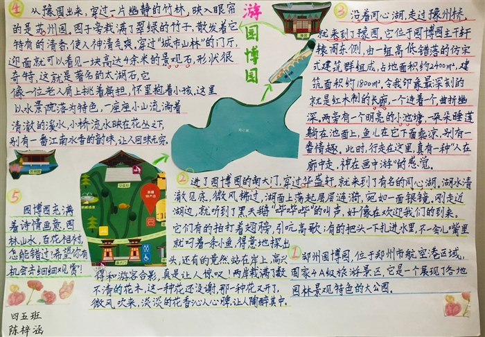 | 游园博园 金水区经三路小学 四五班 陈梓涵 假期,我和爸爸妈妈一起去郑州园博园游玩。 一到这里,我就被眼前诗情画意的景色所吸引。听爸爸说,这里是国家4A级旅游景区,它是一个展现了各地园林景观特色的大公园。 进了园博园的南大门,穿过华盛轩就来到了有名的同心湖。湖水清澈见底,微风拂过,湖面上荡起层层涟漪,宛如一面银镜。刚走近湖边,就听到了黑天鹅“哔哔哔”的叫声,好像在欢迎我们的到来。它们有的拍打着翅膀引吭高歌;有的把头一下扎进水里,不一会儿嘴里就叼着一条小鱼,得意地探出头;还有的竟然站在岸上高兴得和游客合影,真是让人惊叹!两岸栽满了不清的花木,这一种花还没谢,那一种花又开了微风吹来,淡淡的花香沁人心脾,让人陶醉其中。