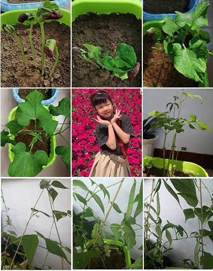 经过我的浇水、施肥,芸豆苗长大了。我还知道了一句话:植物生长需要水、阳光、空气。