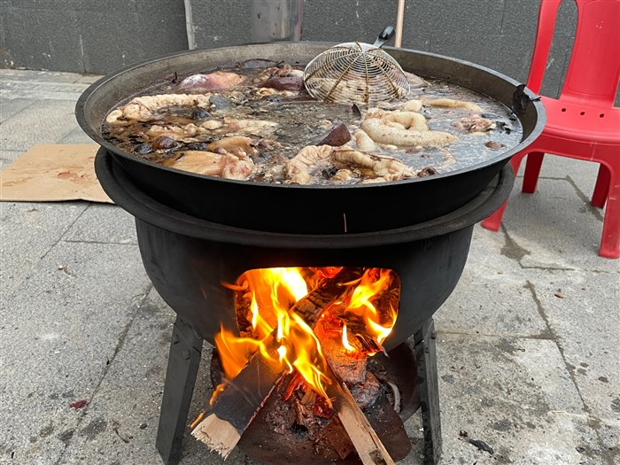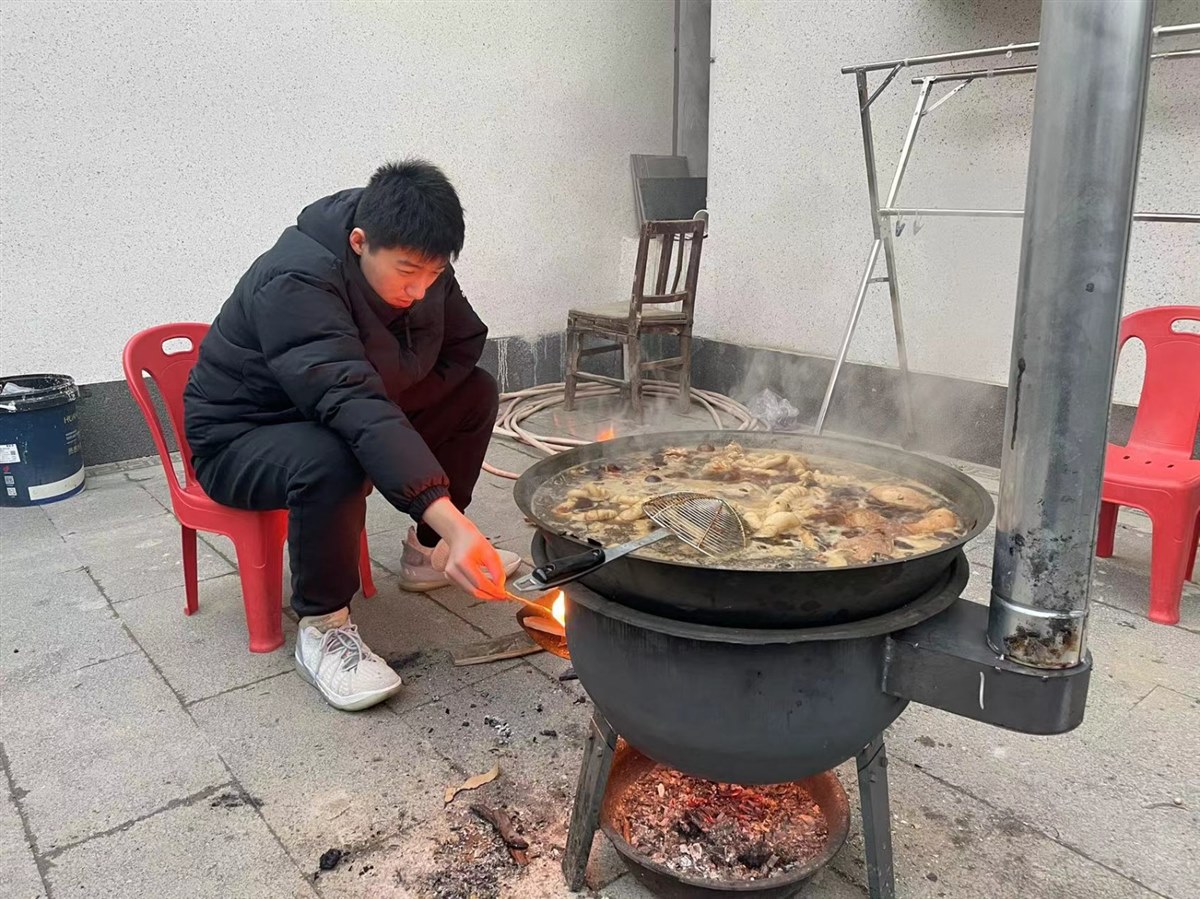 炉膛内的火噼里啪啦的响着,红通通的,跳跃的火焰尽情释放着光和热,大铁锅内年肉在沸腾……