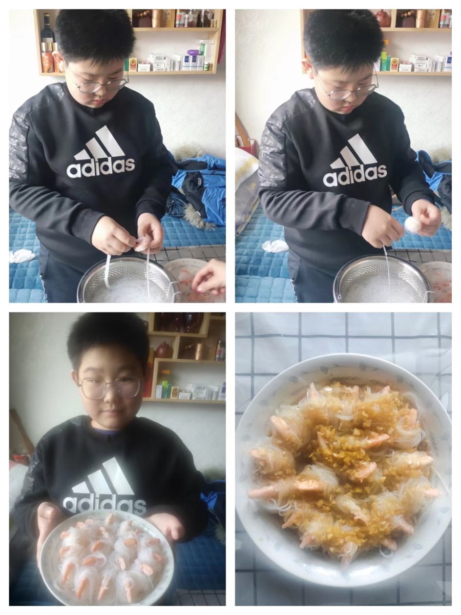 | 今天我来露一手 郑州市经三路小学 吴梓源 今天是大年初二,我和爸爸妈妈带着礼物来给姥爷,姥姥拜年! 姥姥正在厨房忙着准备午饭。哇,好多啊,有鲍鱼、鲈鱼、带鱼、鲜虾、排骨、鸡翅,五花肉,还有一些蔬菜,真是应有尽有,一盘盘摆了一大片。我说:“姥姥,今天的午餐好丰盛啊!我来帮您吧,让我也来露一手,可以吗?”姥姥说:“好啊!你看看能做哪道菜?”我说:“我一进来就瞄上那盘鲜虾了,今天就由我来做一道蒜蓉粉丝虾球吧。” 这道菜是昨天刚跟爸爸学做的,今天正好露一手。需要准备的食材除了鲜虾,还要配一些龙口粉丝和油烹料汁需要的辅料。一切准备就绪,开始制作。先把粉丝加温水泡发,接着清洗鲜虾,去掉虾头虾皮和虾线,在开水中煮一下。用左手拿一只虾,右手拿少许泡好的粉丝,在虾的中部缠绕几圈形成一个球形,再把缠绕好的虾球摆入盘中。这道程序很重要,看着简单,对我而言实际操作起来还是有一定难度的。还好,昨天已经练过手,今天就没有手忙脚乱了,在家人的观摩中,我顺利的把粉丝虾球摆满了一盘。 接下来油烹料汁,由于锅太重我端不起来,这道工序就需要爸爸帮忙一起完成。锅中烧油,放入蒜末炒香,加入调好的料汁,翻炒均匀,然后将翻炒好的蒜蓉料汁浇在虾球上面 ,美味可口的蒜蓉虾球就做好了。 我把它端出来摆上餐桌。嗯,闻着就香,姥爷和姥姥都尝了一个,说:“粉丝虾球这道菜,不仅好吃,造型也好看,还真有点像饭店大厨做的,给源源点赞了。” 听着夸赞声,我咧着嘴笑了,这道菜很受家人们喜欢,光盘了。 |