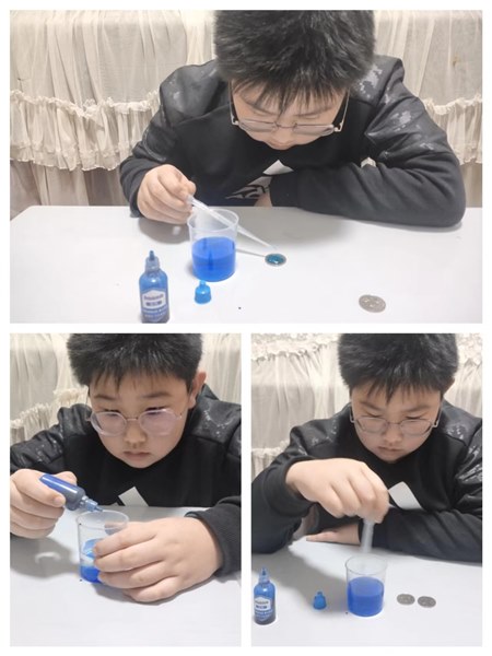 | 喜学爱探,“兔”发奇想 郑州市经三路小学 吴梓源 今天我给大家分享一个既有趣又简单的小实验——硬币装水。 需要准备的实验材料有:量杯、色素,滴管和一枚硬币。开始实验,先把所有的实验材料摆放在实验台上面,然后往装水的量杯里滴几滴蓝色的色素搅拌均匀,拿出滴管吸满色素水,把滴管放在硬币的上面,然后给滴管加力后,滴管里的水就一滴一滴地落在硬币的上面,随着水一滴一滴地落下,我们发现,硬币被水填满了,却不会溢出来,继续滴,会不会有奇迹发生呢?一滴,再一滴,哇,硬币上面的水珠越来越大,像一块晶莹剔透的蓝宝石,还是没有溢出来,继续一滴两滴……,哎呀,终于到了极限,水珠破裂,水溢出来了,并且像泄洪一样溢出一堆,硬币上所剩无几。 硬币居然可以装这么多水,其实这并不是硬币的功劳,而是借助了水的张力。水分子很奇特,它们之间是相互吸引的,外面的水分子被里面的水分子像磁铁一样吸引。简单地说就是水分子就像吸铁石一样你吸我我吸你,所以才会被撑住不往外溢出。 这个简单有趣的小实验,大家都可以试着做一做。有人会问色素有什么用?色素的作用就是比纯水看得更清晰,并且可以把水调成你喜欢的颜色,让这个小实验变得更加有趣哟。 |