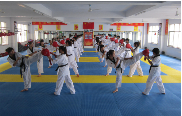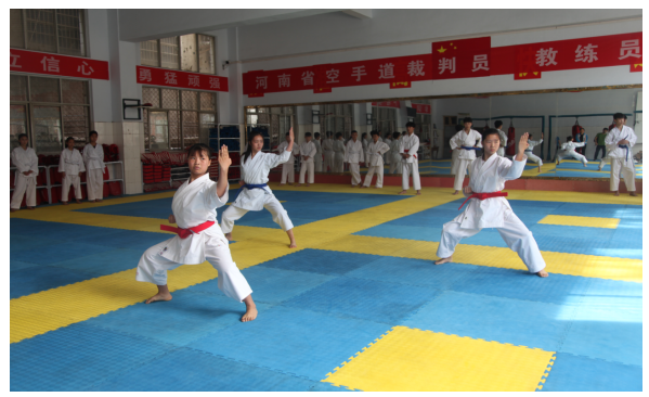 空手道:学习空手道的基本动作、主要学习国家规定的松涛流、糸东流、刚柔流及团体型。
