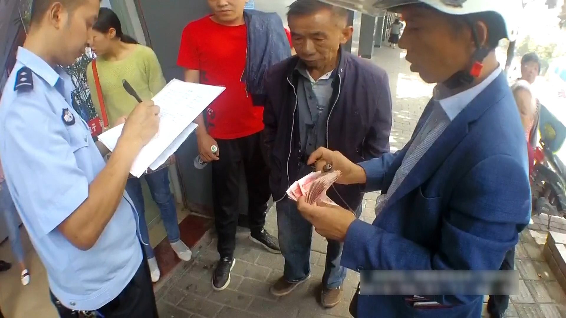 原来,掉钱的老人姓苏,因为家人生病住院,苏大爷刚到银行取了一万元准备支付医疗费用,没想到半路却发生了意外。经过核对苏大爷提供的银行取款手续,民警最终确认他就是失主,接过失而复得的一万元,苏大爷是连连道谢。