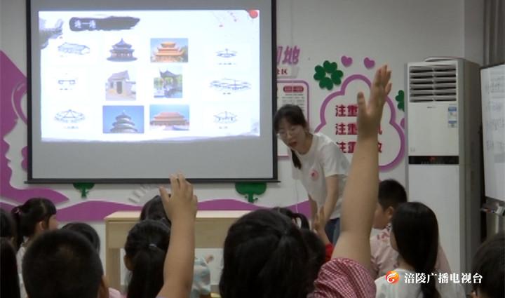 来自长江师范学院土木建筑工程学院的大学生志愿者正在为望涪社区的孩子们上课,志愿者从古建筑的风格、结构讲起,从故宫讲到了岳阳楼、黄鹤楼。