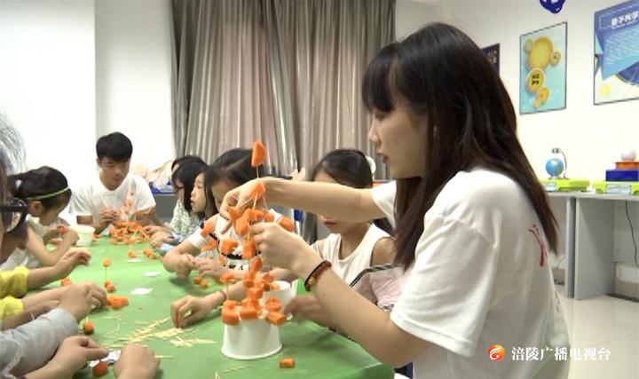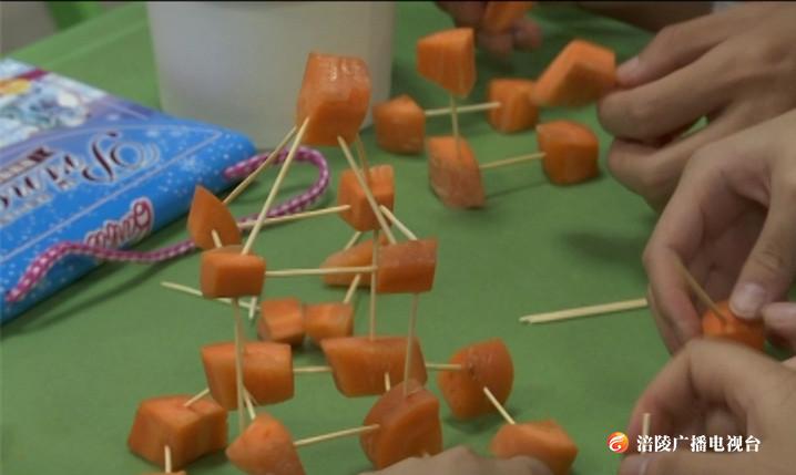 课堂上,大家还一起动手,用胡萝卜和牙签实现“建筑梦”。