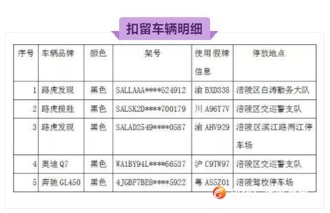 涪陵区公安局交通巡逻警察支队在执勤执法过程中查处了以下五台越野车使用其他机动车号牌的违法行为,并对涉案车辆进行了扣留,经初步核查五台车辆涉嫌非法拼装走私入境,现对该五台车辆进行公告三个月,如车辆所有人在三个月内无法提供车辆相应的合法证明,交巡警支队将报请有关部门对其依法处理。