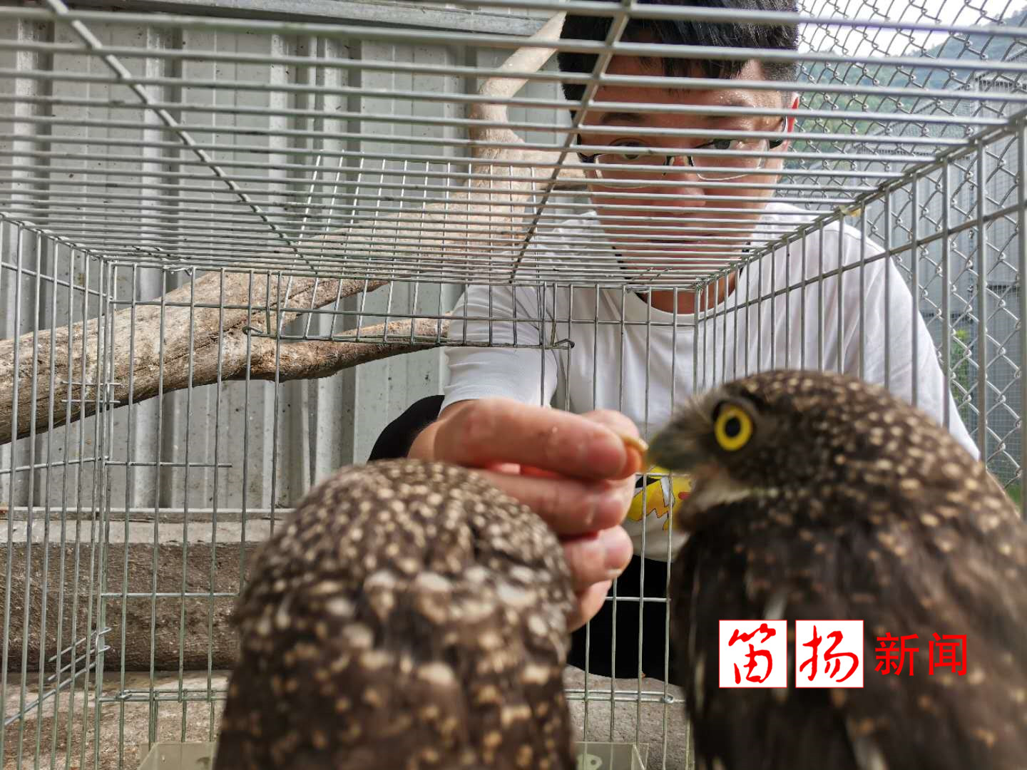 在新“家”里,保护点的负责人王尧精心照顾着这些受伤和迷途的“小生灵”,他把小猫头鹰住的笼子打扫得干干净净,请来了动物医生为它们治伤,还每天买新鲜的猪肉和大麦虫喂小猫头鹰吃,“小家伙刚来时怕生,喂食时把我的手都抓出了血,现在它们安分多了”说起这些乖巧可爱的小猫头鹰,王尧脸上挂着疼爱的微笑。