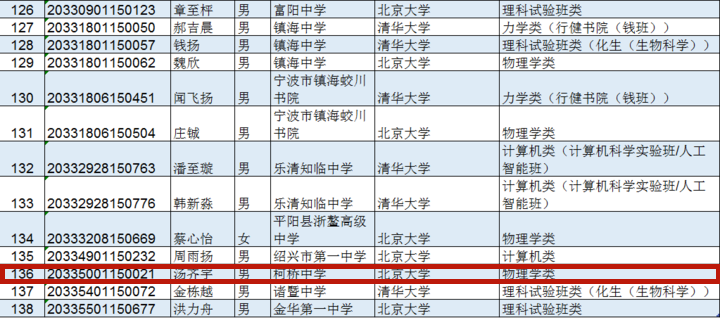 昨天,浙江省教育考试院发布了2020年浙江省普通高校保送生拟录取名单,138人获得全国重点大学保送资格。其中,绍兴市共有3人获得全国重点大学保送资格,而来自柯桥中学的汤齐宇获得了一个保送资格。