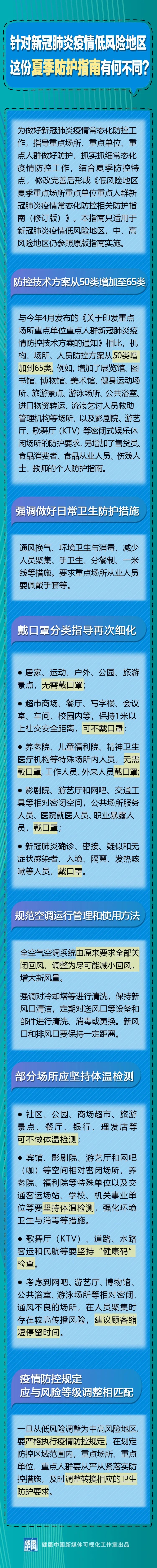 为做好新冠肺炎疫情常态化防控工作,指导重点场所、重点单位、重点人群做好防护,结合夏季防控特点,我们对《重点场所重点单位重点人群新冠肺炎疫情防控相关防控技术指南》进行了修订调整,形成《低风险地区夏季重点场所重点单位重点人群新冠肺炎疫情常态化防控相关防护指南(修订版)》。本指南只适用于新冠肺炎疫情低风险地区,中、高风险地区仍参照原版指南实施。有关措施如下: