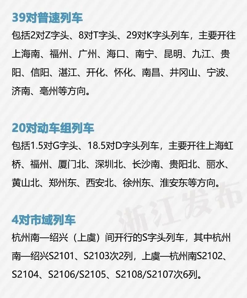 此外,除了合杭高铁合湖段、通沪铁路一期开行的列车外,铁路部门还增开其他长途直通列车8对(其中日常线3对、高峰线5对),增开其他短途管内列车19.5对(其中日常线18.5对、高峰线1对)。