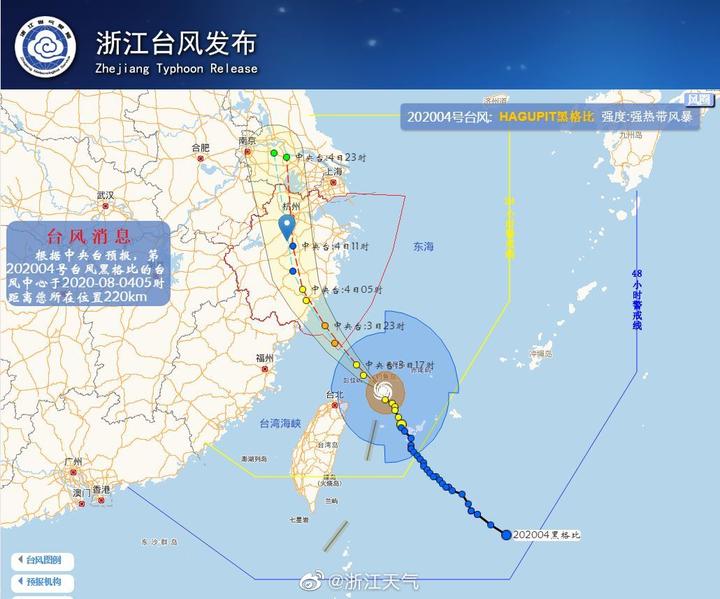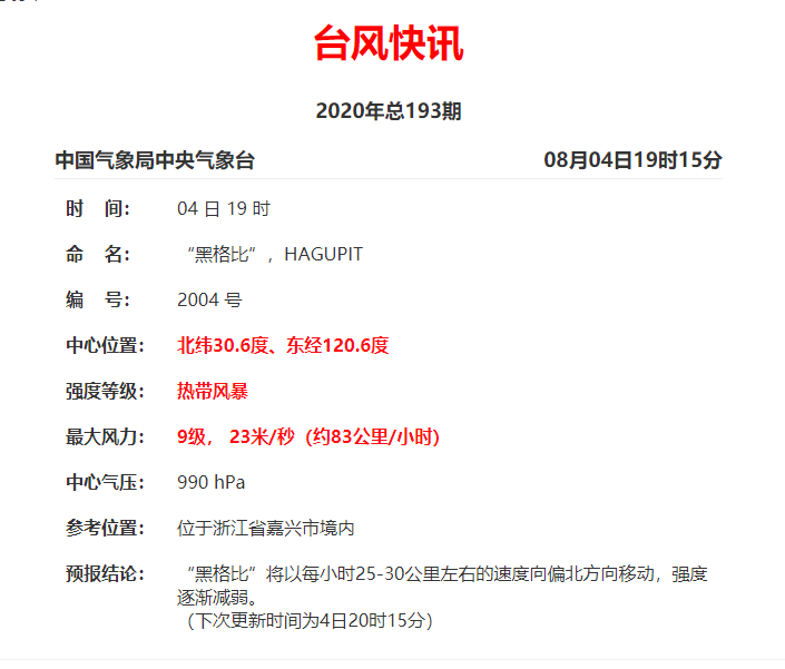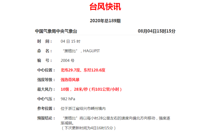 2020年第04号台风(强热带风暴级)黑格比08月04日16时位于北纬29.9°、东经120.6°,最大风速25m/s,中心气压985hPa,目前位于绍兴市城区,将以每小时28公里左右的速度向偏北方向移动,强度逐渐减弱。