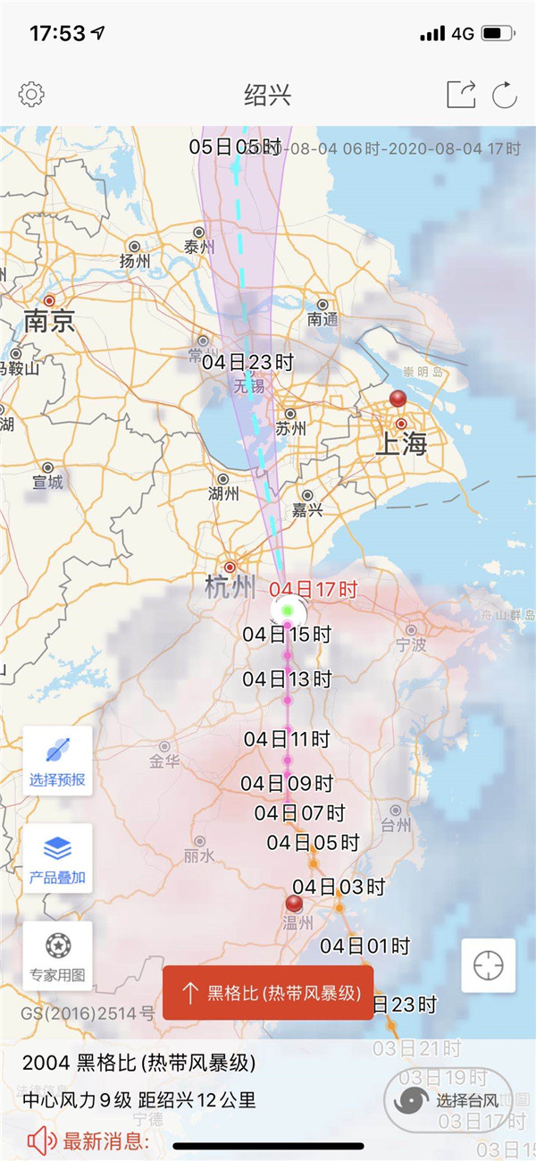 据中央气象台消息,今天(8月4日)晚上7时,台风“黑格比”已在嘉兴市境内。