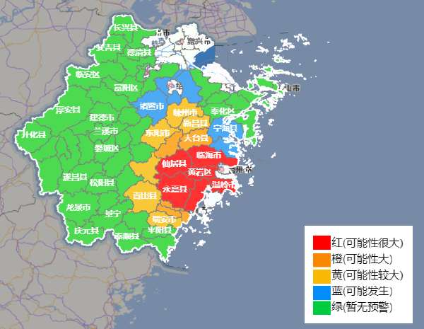 根据省气象台未来降雨预报,预计8月3日20时至8月4日20时,宁海县、柯桥区、上虞区、诸暨市、三门县可能发生山洪灾害(蓝色预警),瑞安市、新昌县、嵊州市、东阳市、青田县、缙云县发生山洪灾害可能性较大(黄色预警),鹿城区、龙湾区、瓯海区、磐安县、天台县发山洪灾害可能性大(橙色预警),永嘉县、乐清市、黄岩区、仙居县、温岭市、临海市发生山洪灾害可能性很大(红色预警)。