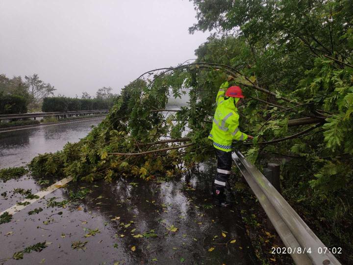 4日早晨,一位高速公路养护工人正在清理被风吹倒的树枝。