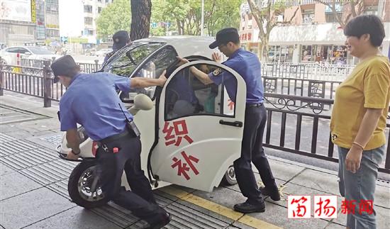 近日,柯桥街道综合行政执法中队开展盲道规范整治行动,对辖区内的人行道盲道进行了排查摸底,并安排对不规范的盲道分阶段进行整治,确保盲道畅通、文明出行。图为执法人员对笛扬路与鉴湖路交叉口一商户门前非机动车占盲道进行整治。