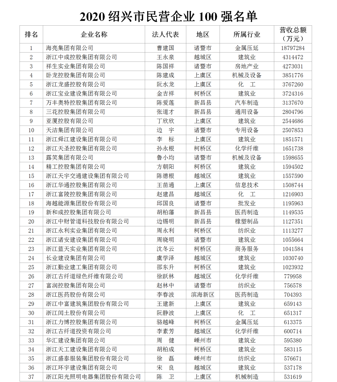 日前,绍兴市工商联根据全国工商联上规模民营企业调研方案,在企业自行申报的基础上,以2019年营业收入总额为标准,排序出了“2020绍兴市民营企业100强名单”。