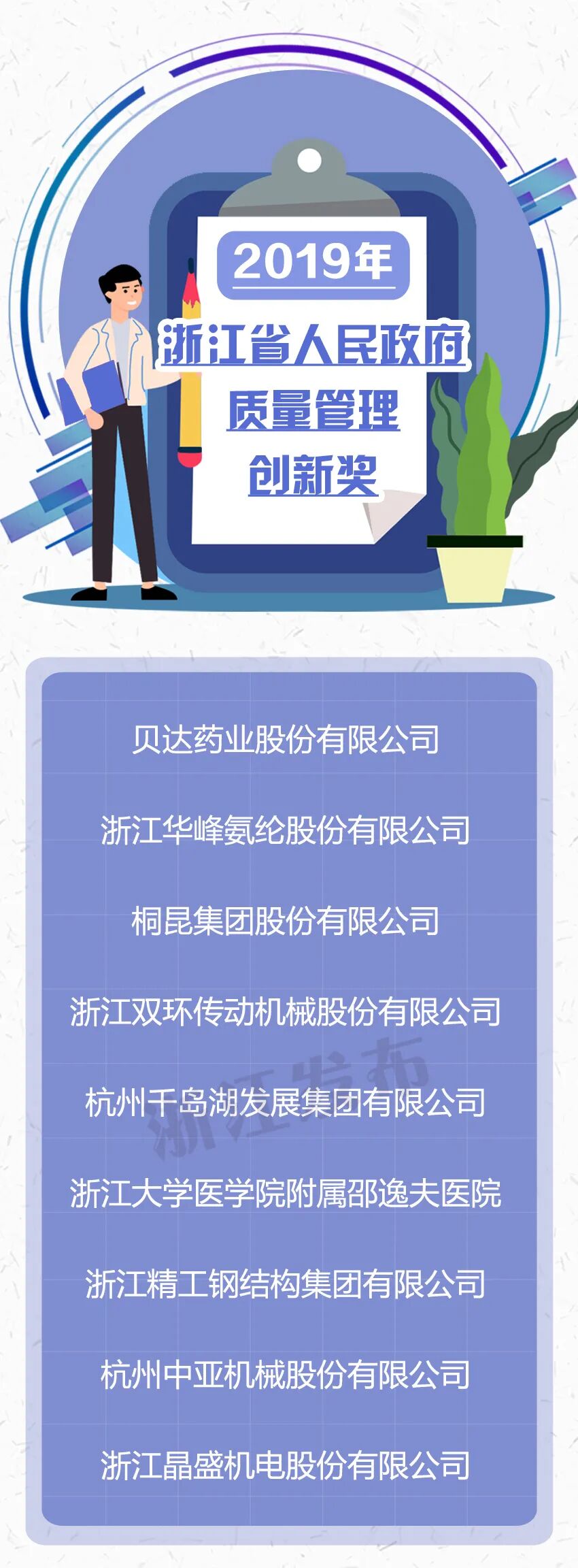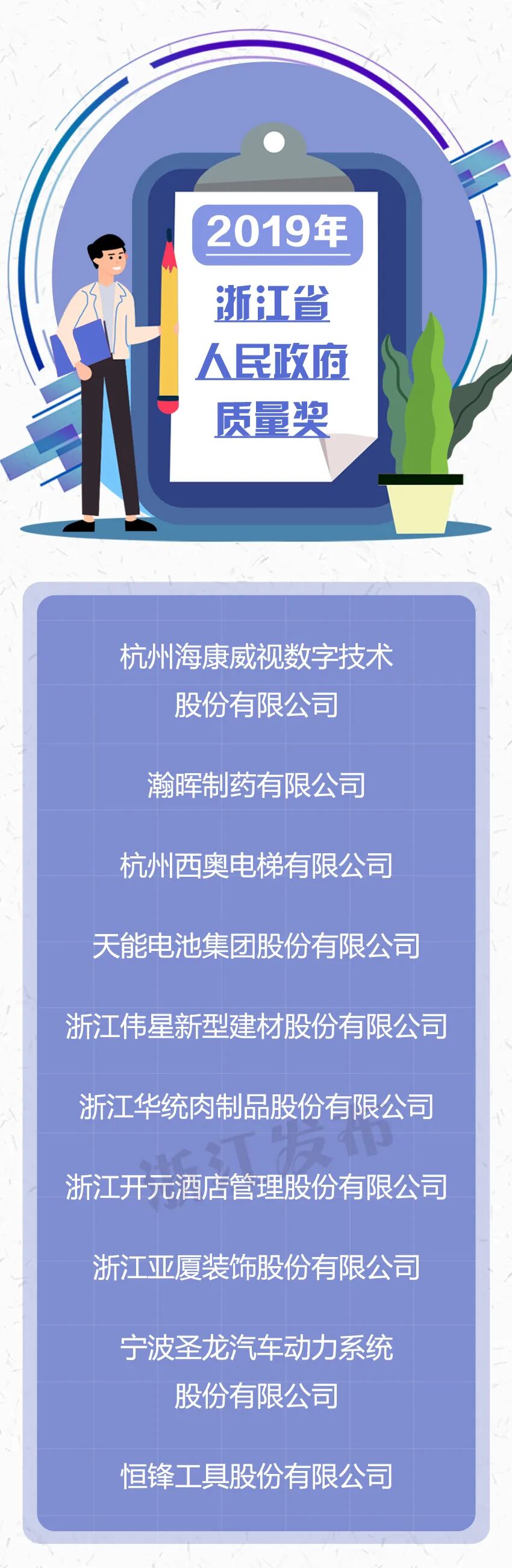 为全面推进质量强省建设,引导和激励全省各行各业加强质量管理,近日,省政府发布《关于表彰2019年省政府质量奖获奖组织的通报》,决定授予杭州海康威视数字技术股份有限公司等10家企业“2019年浙江省人民政府质量奖”,授予贝达药业股份有限公司等9家单位“2019年浙江省人民政府质量管理创新奖”、授予杭州市政府等“2019年浙江省人民政府质量奖组织奖”,并予以通报表彰。