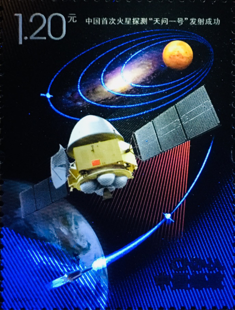 《中国首次火星探测“天问一号”发射成功》邮票规格采用33*44毫米,以“天问一号”探测器为画面主体,展示了“天问一号”探测器从发射到入轨的过程。在邮票画面上,视线从左下角的地球出发,看火箭升空,随同探测器一道,经过宇宙空间的运行轨道,再往远处右上角的火星奔去,分别表现了地球、火星和星系。