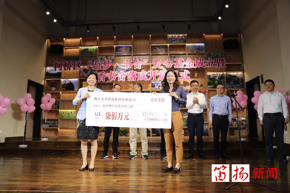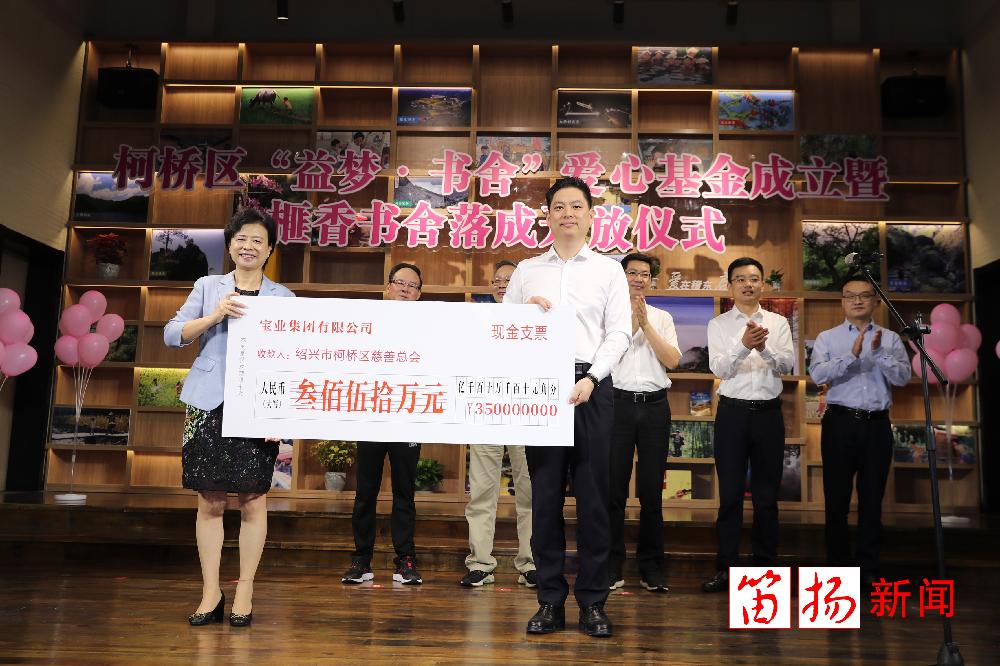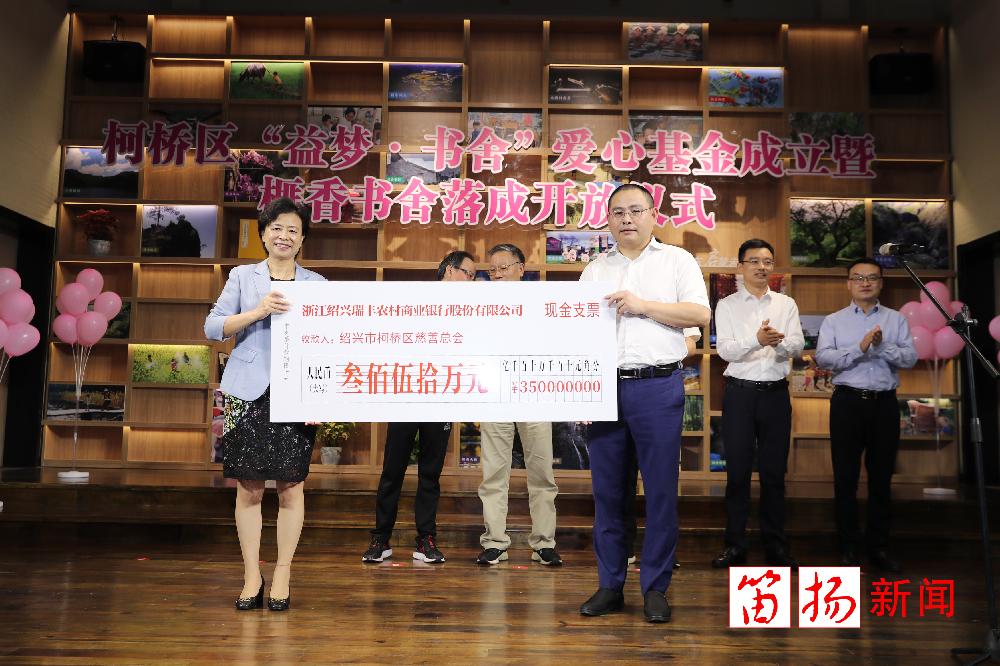 活动现场,天圣集团、宝业集团、瑞丰银行三家爱心企业共同认捐1400万元,用于成立2000万元的柯桥区“益梦·书舍”爱心基金”,旨在支持乡村书舍建设,推动构建书香社会,体现企业履行社会责任、助力慈善事业的价值追求,为乡村的慈善公益事业、文化事业发展注入强大活力。