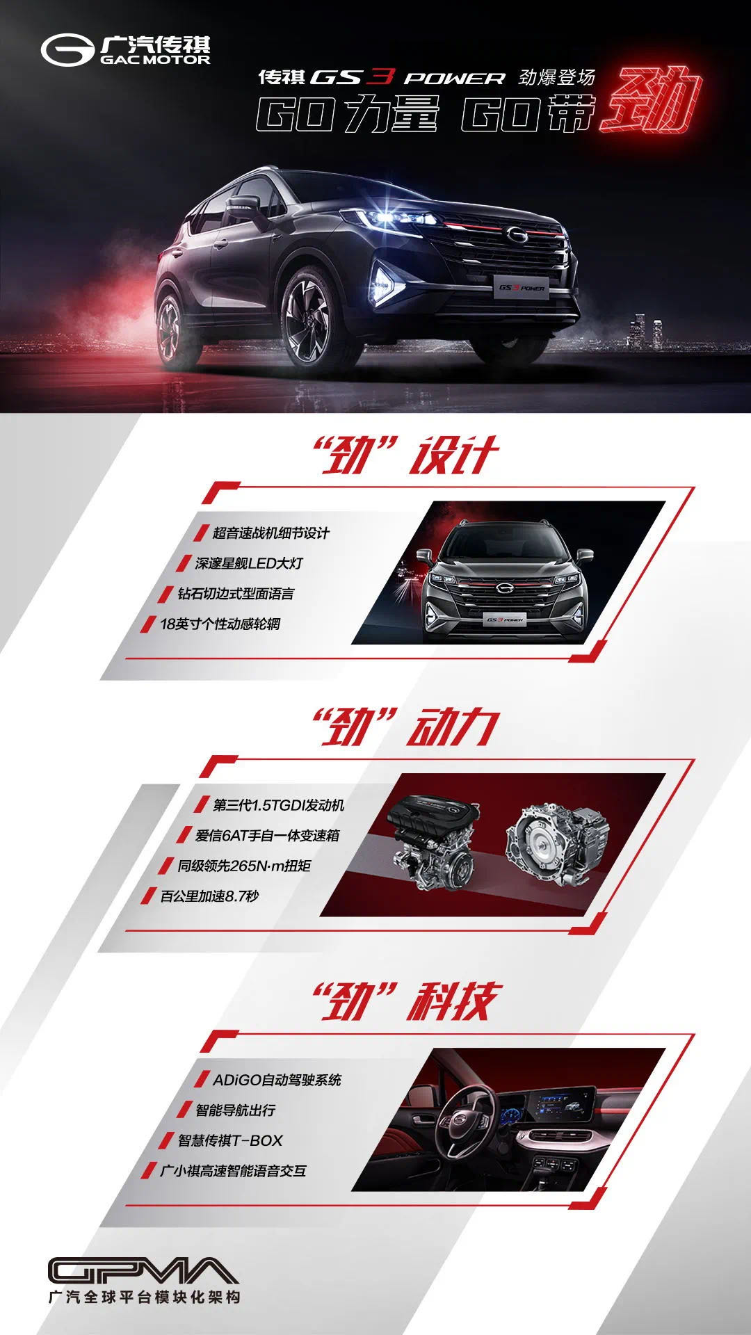 传祺GS3 POWER预售价格为:不高于8.5万元~10.5万元,下订即享3888元现金上劲礼,超级0首付,可享受1-5年免息,至高送3年交强险和百万驾意险,为消费者带来“够劲”的实惠!