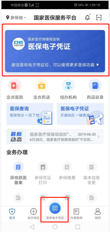 1、登录“国家医保服务平台APP”平台后,进入医保电子凭证页面,点击页面上方的医保电子凭证图标。