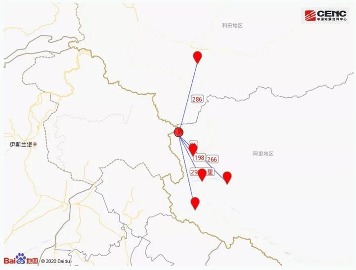 周边县城:震中距日土县95公里、距噶尔县198公里、距革吉县266公里、距新疆和田县286公里、距札达县297公里,距新疆和田地区346公里,距拉萨市1236公里。