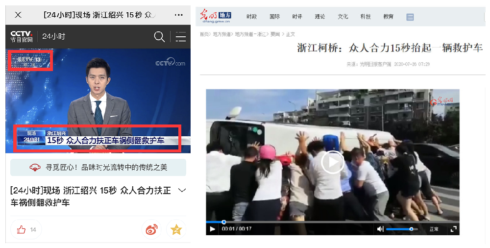 23日,一条“柯桥市民15秒合力抬起侧翻救护车”的新闻在全国范围内引起关注,对外传播部通联编辑及时将这一暖心新闻上送央视、省级媒体等,该新闻在中央电视台多时段多频道滚动播出,包括央视13套《新闻直播间》、《24小时》、央视2套《第一时间》等,光明日报客户端、浙江钱江频道、浙江新闻频道、浙江6频道、浙江教育科技频道等也先后播出。一时间,各大媒体纷纷报道,全网阅读量突破5800万,让“15秒最美救护群像”成为现象级热词。