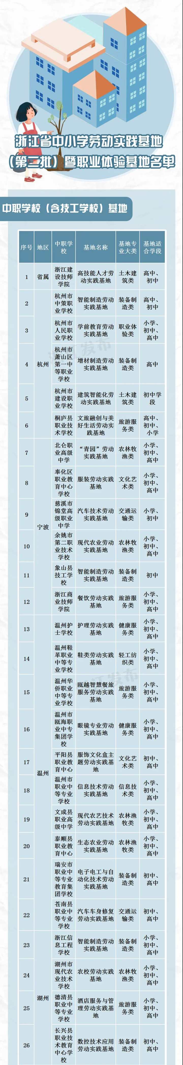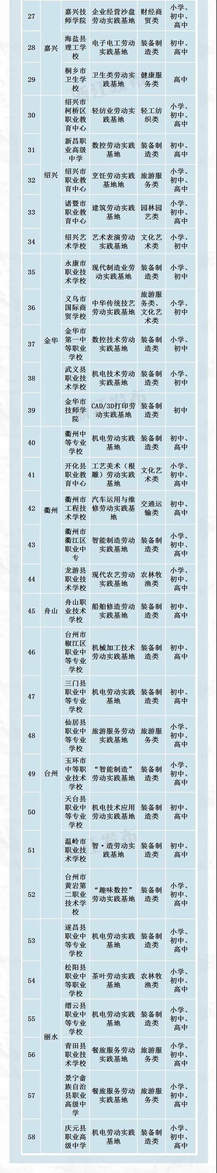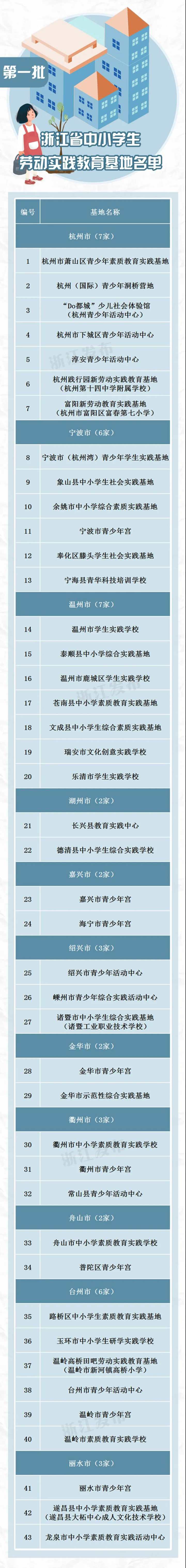 此前,省教育厅办公室已公布了第一批浙江省中小学生劳动实践教育基地名单,共43家。