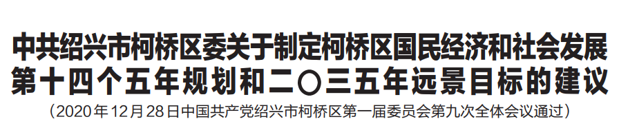 中国共产党绍兴市柯桥区第一届委员会第九次全体会议,认真学习贯彻党的十九届五中全会、省委十四届八次全会和市委八届九次全会精神,就制定绍兴市柯桥区国民经济和社会发展“十四五”规划和二〇三五年远景目标提出以下建议。