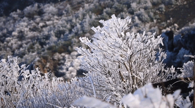 迎着呼啸的北风登上括苍山山顶,漫山雾凇,将枝枝叶叶染上银装,仿佛走进冰雪王国,从早晨至黄昏变幻着不同的美丽。