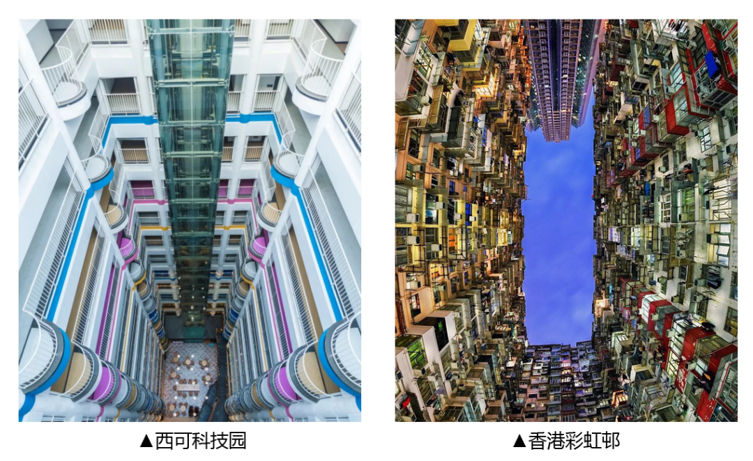 滨江西可科技园4号楼把彩色融入建筑结构当中,视觉效果非常震撼。整个楼以对称的角度构成,每层楼都是不同的颜色,可以媲美香港的彩虹邨了。