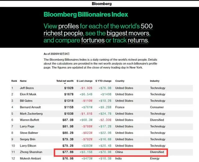彭博亿万富翁指数显示,截至12月31日,钟睒睒身家778亿美元,印度信实工业集团董事长穆克什·安巴尼财富为769亿美元,钟睒睒以9亿美元优势成为亚洲首富。