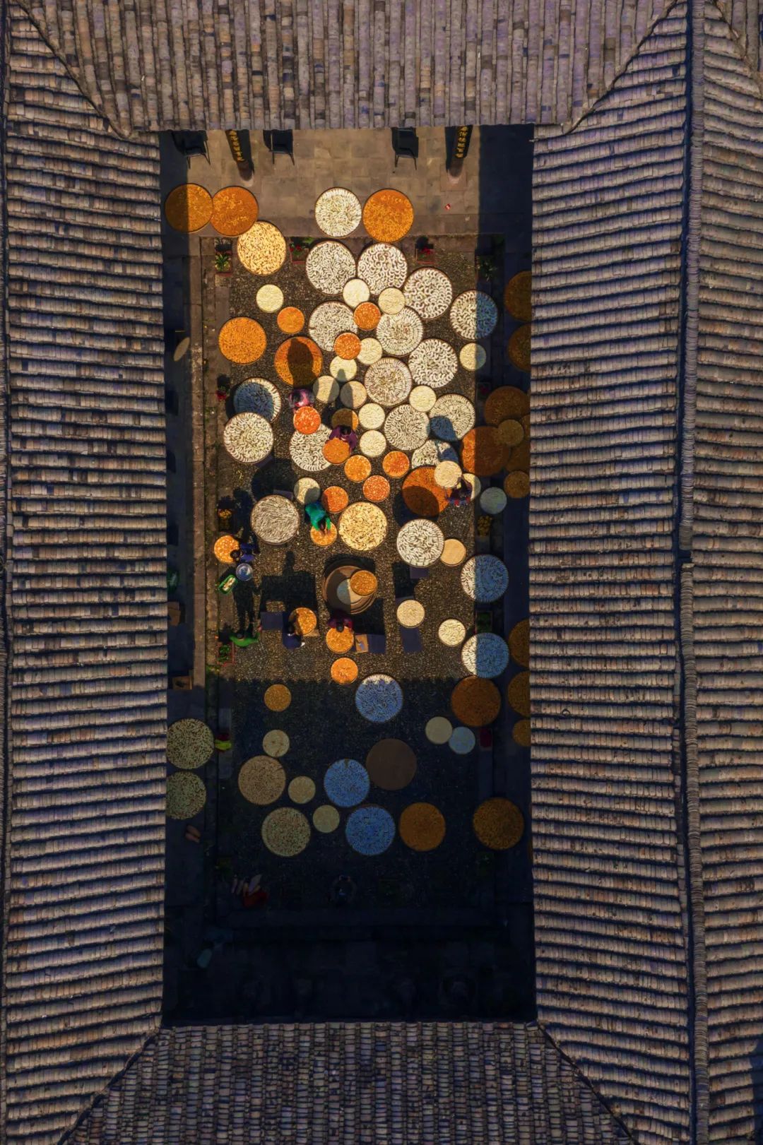 上百栋民居在百米落差的山坡上错落排布,家家开窗采光、户户支架晒秋,老屋子的房檐上,摆布着圆圆的竹匾,院子里的平地上,到处都是需要晒制的美食。