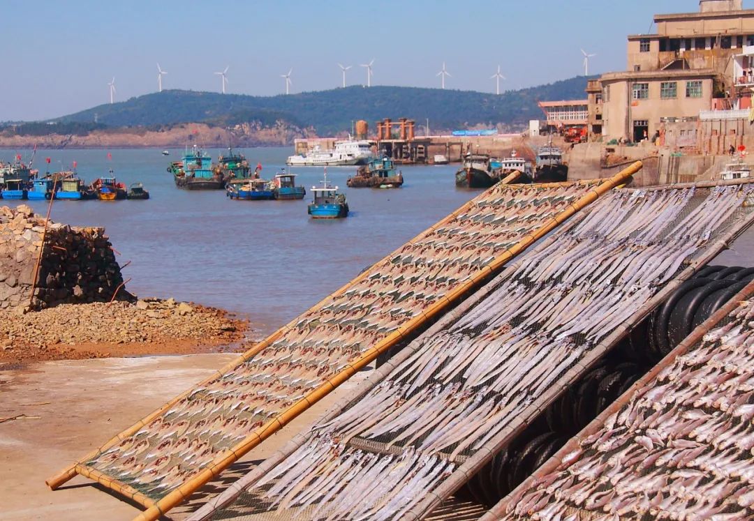 冬季的大陈岛,自码头至渔村,家家户户几乎都在晒着海鲜,长长的鳗鱼、岛上盛产的黄鱼……透过阳光,橙红剔透,诉说着海岛的丰收和大海的味道。