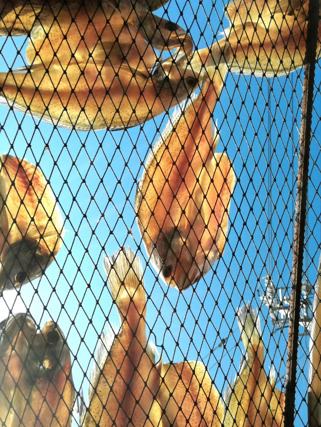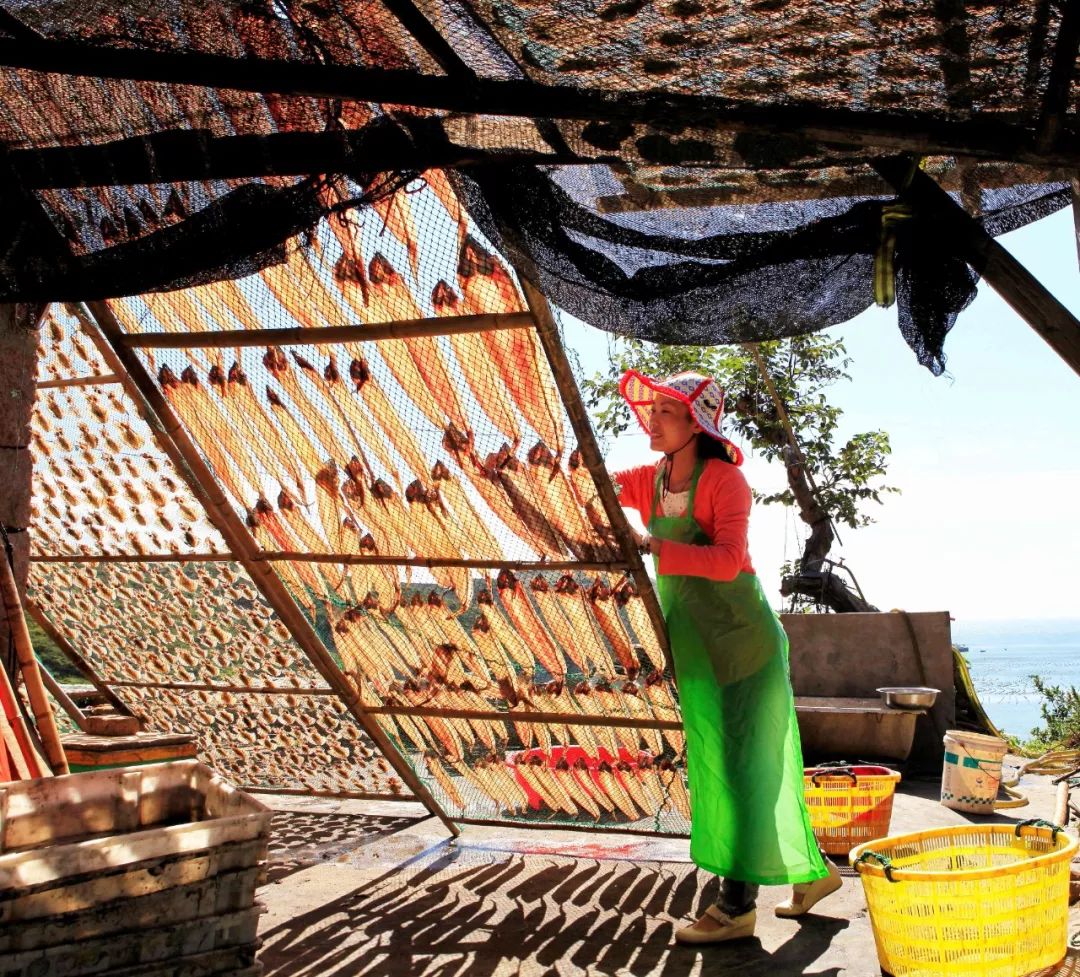 海船拉回大批量海货,晒在马路旁,密密的竹帘散开去,红虾、肥鳗填满每一处空地,甚是壮观。太阳裹着海风,发酵着每一只海虾、每一条鱼干,温度高一度,日照长一秒,鲜味就浓一分!
