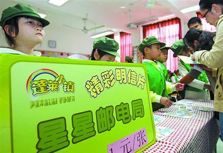 每周五下午,黄浦区蓬莱路第二小学就会变为一座欢乐的“蓬莱小镇”。 40间教室成了小镇的邮局、医院、银行、超市、警察局、电影院等40个公共场所,80名老师和1124名学生则化身小镇镇民,他们拥有小镇的护照、货币和存折,在这个模拟的微型社会中,学习与人交往,体验社会百态。