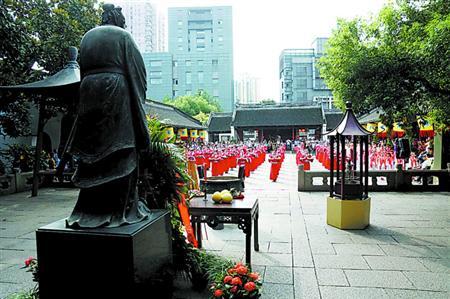 礼乐声起,八音齐备。48名身着传统佾生服装的敬业初级中学学生,在上海文庙大成殿前,优雅庄重地表演新编孔子乐舞,向先贤传递尊重和敬意。