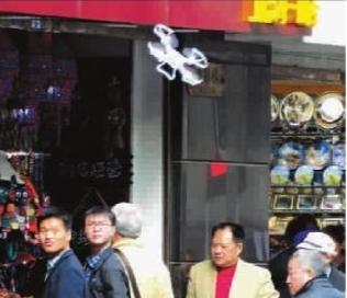 遥控飞行器竟然在闹市街头穿梭,一会儿飞到车流中,一会儿飞到行人头顶。短短200米道路,竟有三四架在轰鸣盘旋。谁在操控?原来是路边商家招徕生意的“实战演示”。