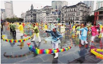 2014国际空竹千人展演大赛今晨在外滩金牛广场举行。一时间,千只空竹上下翻滚,千条彩龙随之起舞,创大世界基尼斯之最