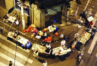 汉口路山东中路,流动摊贩长期盘踞在此,马路已经被油腻浸润得有些发黑,而这只是申城无序设摊的一个缩影。