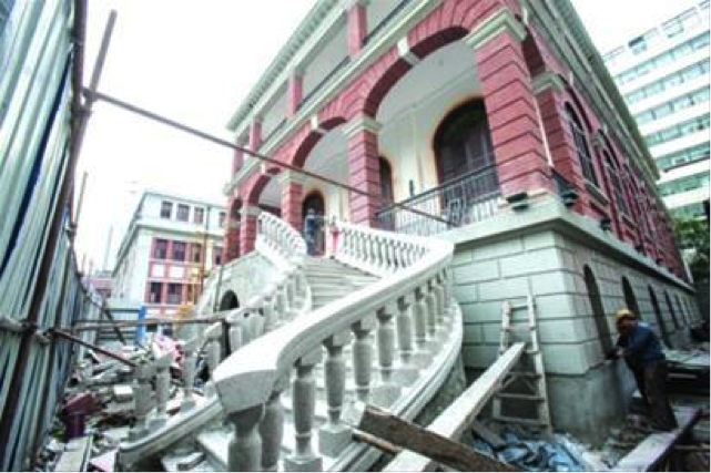 会审公廨前的巴洛克风格楼梯得以按原样修复 据《新闻晨报》报道,在过去的很多年里,建国中路20号和22号的大门常年紧闭,就连很多周边居民都不知道,在高高的围墙里,竟然“藏”着两幢近100岁高龄的老建筑——原法租界会审公廨旧址和原法租界警务处旧址。近日,老楼外的围墙被拆除了,得以修旧如故的老建筑恢复了原貌,修缮工程已近完成。