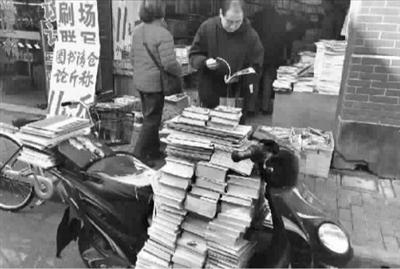 福州路一书店处理一批旧书,书价便宜论斤称,有书迷书买得太多,用助动车来搬。
