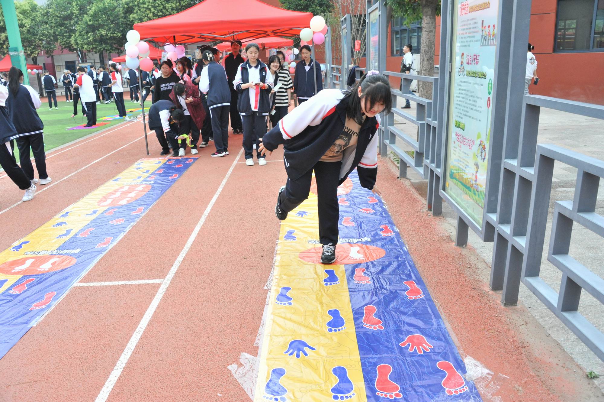 活动现场热闹非凡,各项活动吸引了同学们积极参与,掌声、欢笑声在整个操场回荡。在“痛并快乐着活动中”,大家穿着袜子在趾压板上跳绳,一分钟连续跳够40个挑战成功,这个过程就像在生活中,我们会碰到大大小小的障碍与困难,需要有强大的意志力去克服它、打败它,学会坚持,不断努力前进,有疼痛也有进步;在“投壶挑战活动中”,精准将羽毛球在一米开外的距离投进垃圾桶即为成功,需要我们排除外界干扰,把握好距离,集中注意力,聚精会神专注挑战;在“交个朋友活动中”,蒙眼带眼罩,靠同学的指挥走向对面的朋友,培养同学间的协调、配合能力,有趣而且富于启发性。