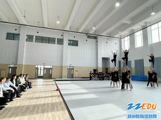 李雅一行先后来到学校体艺楼,实地参观了啦啦操房、体育舞蹈操房、艺术舞蹈操房和三楼比赛场馆。每到一处,他们都仔细查看场馆设备配置、空间布局和环境建设情况,对学校在硬件设施投入上的积极作为表示肯定。大家还驻足观看了各训练队的日常训练课和精彩的节目展示。学生们在教练的指导下进行着高强度的专业体能训练,他们身姿矫健、步伐有力;舞蹈室里,学生们翩翩起舞,用优美的舞姿诠释着艺术的魅力。学生们专业的训练状态和饱满的精神风貌,赢得了在场领导的阵阵掌声。