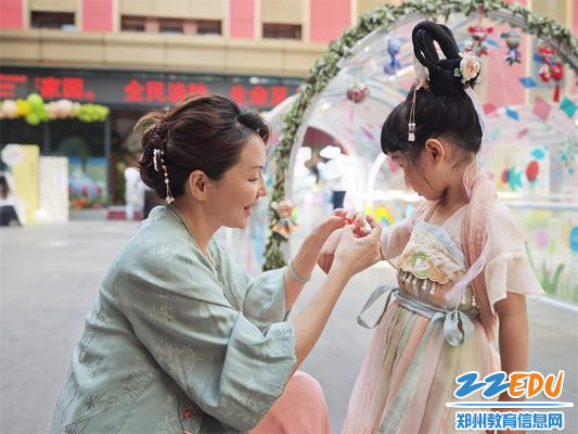 郑州市实验幼儿园党总支书记、园长张莉为孩子戴上五彩绳